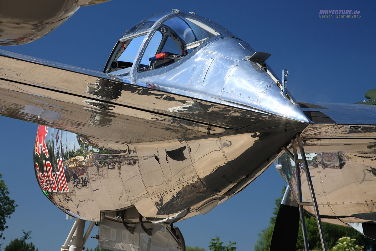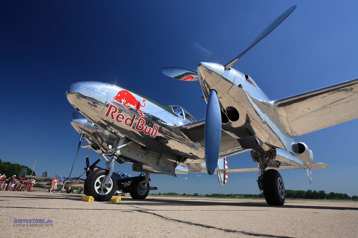 Und noch ein hochglanzpoliertes Schmuckstück mit zwei Motoren - eine Beschreibung dürfte hier nicht nötig sein, es kennt sie doch jeder, die P-38 der Flying Bulls.
