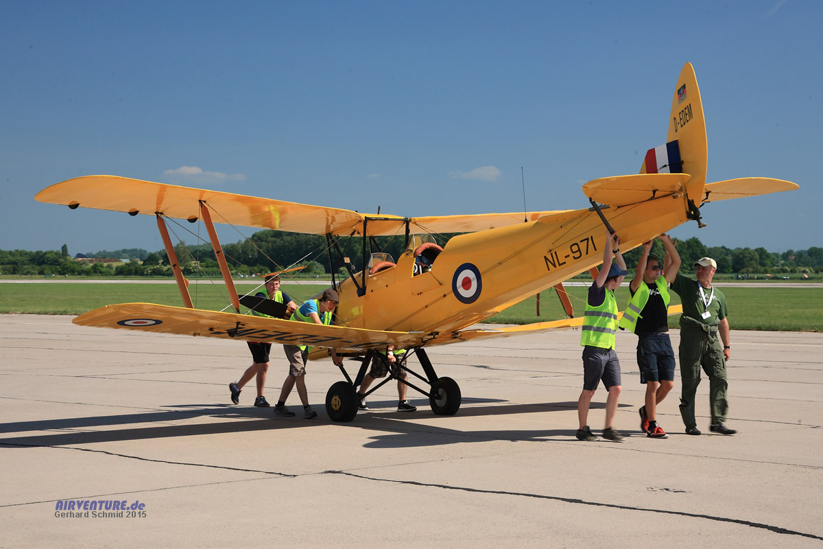 Eine Tiger Moth kann man durchaus mal mit ein paar helfenden Händen umparken...