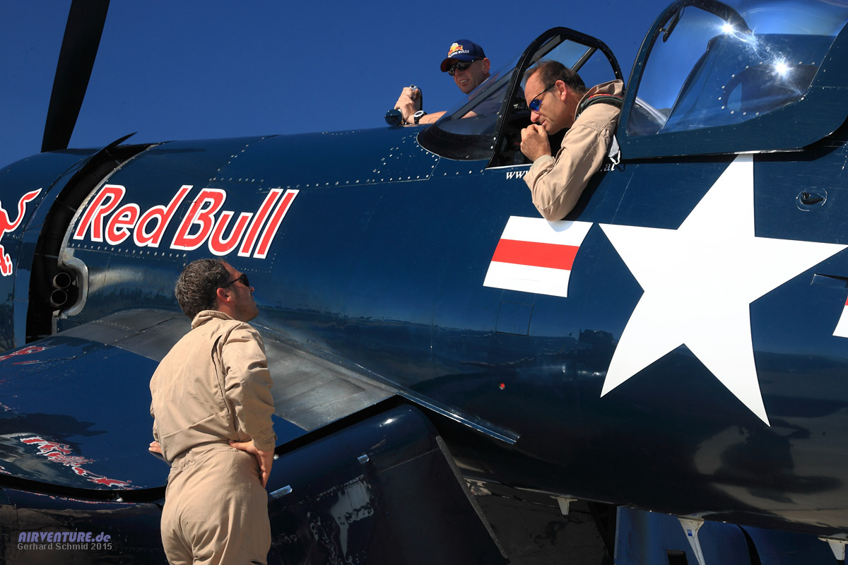 Weil ein Bulle selten allein kommt, war auch die Corsair mit von der Partie - geflogen von Eric Goujo, hier im Gespräch mit Raimund Riedmann, dem Piloteur der Lightning und Flugbetriebsleiter der Flying Bulls.