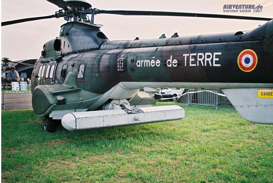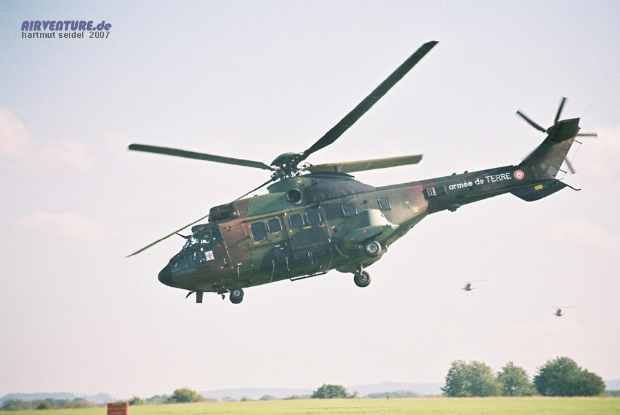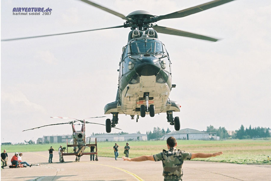 Bei der Luftlandedemonstration während der Phalsbourg Heli-Airshow 2007 wurden auch mit diesem Transporthubschrauber vom Typ Eurocopter Cougar Truppen abgesetzt. Rechts im Hintergrund sind zwei mit Panzerabwehrlenkflugkörpern vom Typ "HOT" ausgerüstete Gazelle-Hubschrauber im Schwebeflug zu erkennen.