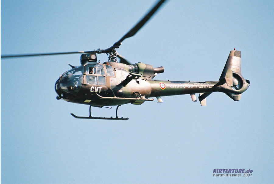 Mit dem ebenfalls über einen langen Zeitraum in großen Stückzahlen gebauten Hubschraubertyp Aérospatiale Alouette II wurde dem Publikum der Phalsbourg Heli-Airshow 2007 auch ein sehr berühmter alter Hubschrauber aus französischer Produktion im Flug vorgeführt. |