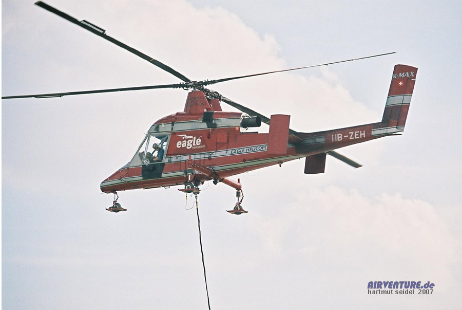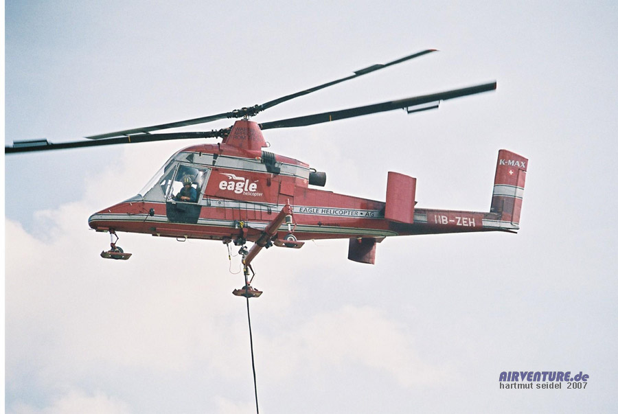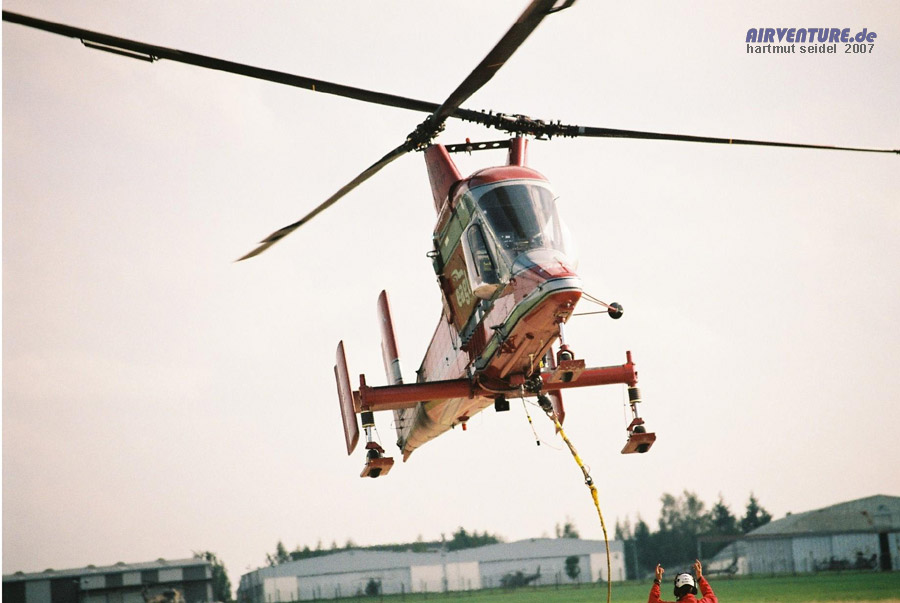 Mit den Flugvorführungen des Lastenhubschraubers Kaman K-Max wurde den Zuschauern der Phalsbourg Heli-Airshow 2007 eine ganz besonders seltene Rarität geboten, denn obwohl schon 1991 der erste K-Max Prototyp geflogen ist und ab 1994 mit der Auslieferung der ersten Serienhubschrauber an die Kunden begonnen wurde, ist bis jetzt erst eine ziemlich geringe Anzahl von K-Max hergestellt worden, von denen wiederum nur extrem wenige Exemplare nach Europa geliefert worden sind. |