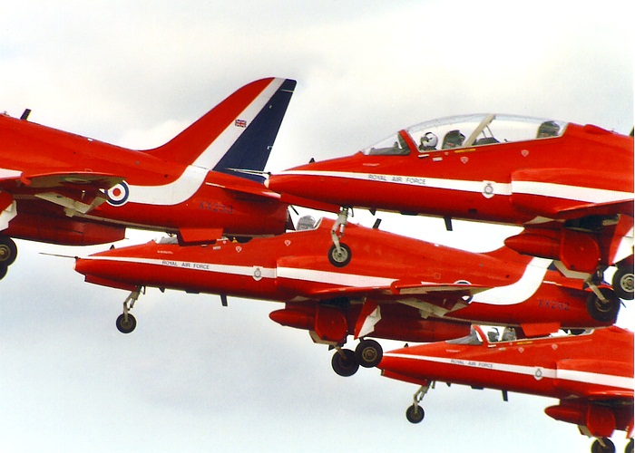 The Red Arrows upgraded from the Folland Gnat to the Hawk in 1980, today 12 aircraft belong to the aerobatics team - 9 are used for the display and the rest are spare planes.