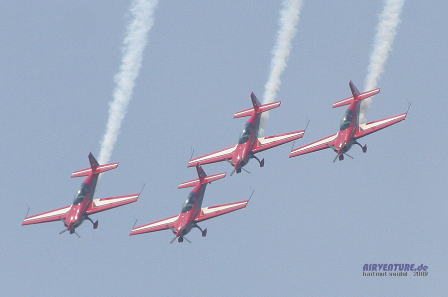 Das sich eine Vielzahl von Solo-Displays mit historischen Maschinen, wie zum Beispiel der Douglas C-47 Dakota, immer wieder mit einer großen Zahl von Einzel- und Formationsflugvorführungen mit modernen Flugzeugen, wie zum Beispiel den Extra 300 der Royal Jordanian Falcons abwechselten, machte einen besonderen Reiz des Flugprogramms des Meeting du Centenaire 2009 in Reims aus. |