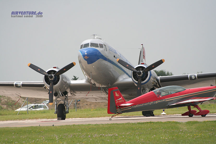 Die zivile Verkehrsluftfahrt der dreißiger und vierziger Jahre wurde im interessanten geschichtlichen Überblick des Meeting du Centenaire 2009 Flugprogramms mit dieser Douglas C-47 Dakota symbolisiert. |