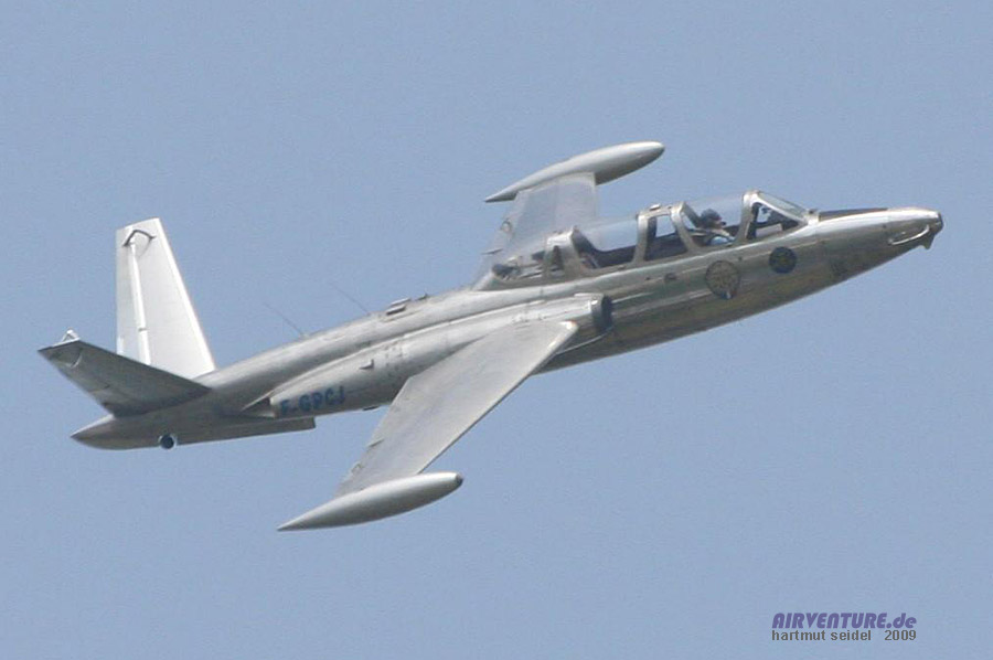 Der geschichtliche Überblick über die Entwicklung der Luftfahrt innerhalb der 100 Jahre seit der berühmten Flugwoche von Reims 1909 beinhaltete auch die Solo-Displays von zwei historischen Jets. Einer davon war dieser in den fünziger- und sechziger Jahren in großen Stückzahlen hergestellte Strahltrainer vom Typ Fouga Magister. |