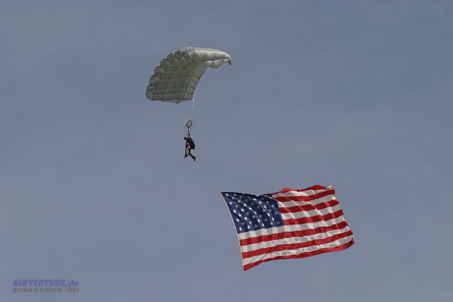 wird, springen Fallschirmspringer aus der C-130. Einer davon schleppt einen Sternenbanner. |