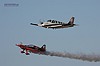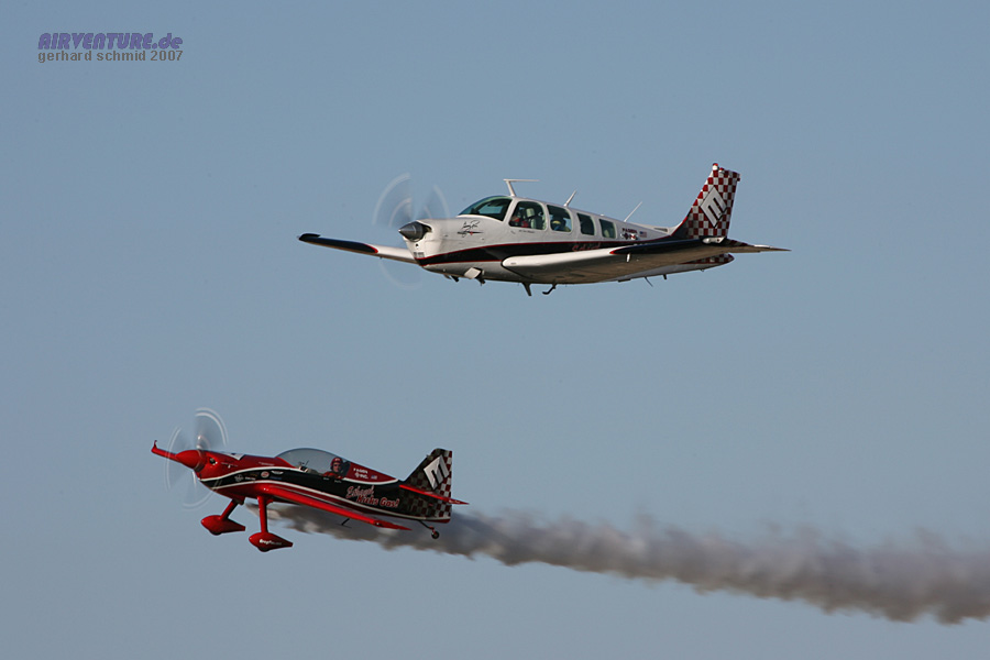David Martin mit seiner Beech Bonanza und Greg Poe in seiner Edge 540 bei einem Formationsüberflug im letzten Sonnenlicht. |