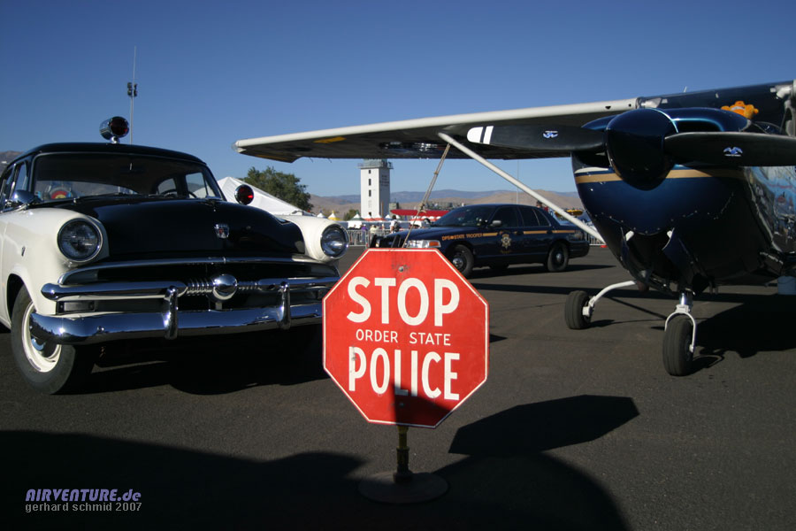 Hier geht's nicht weiter. Auf Hochglanz poliert präsentierten die Hüter über Recht und Ordnung eine Cessna 172 RG und diverse Fahrzeuge. |