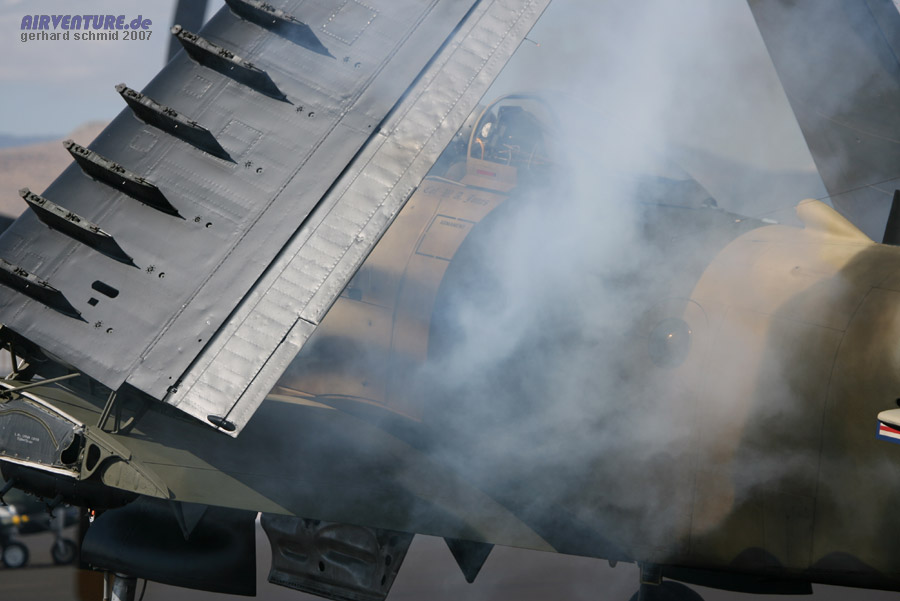 Für den Fan großer Kolbenmotoren immer wieder ein beeindruckendes Schauspiel: Begleitet von starker Rauchentwicklung erwachen nach und nach die 18 Zylinder der Douglas Skyraider zum Leben. |
