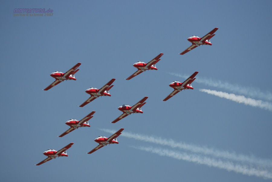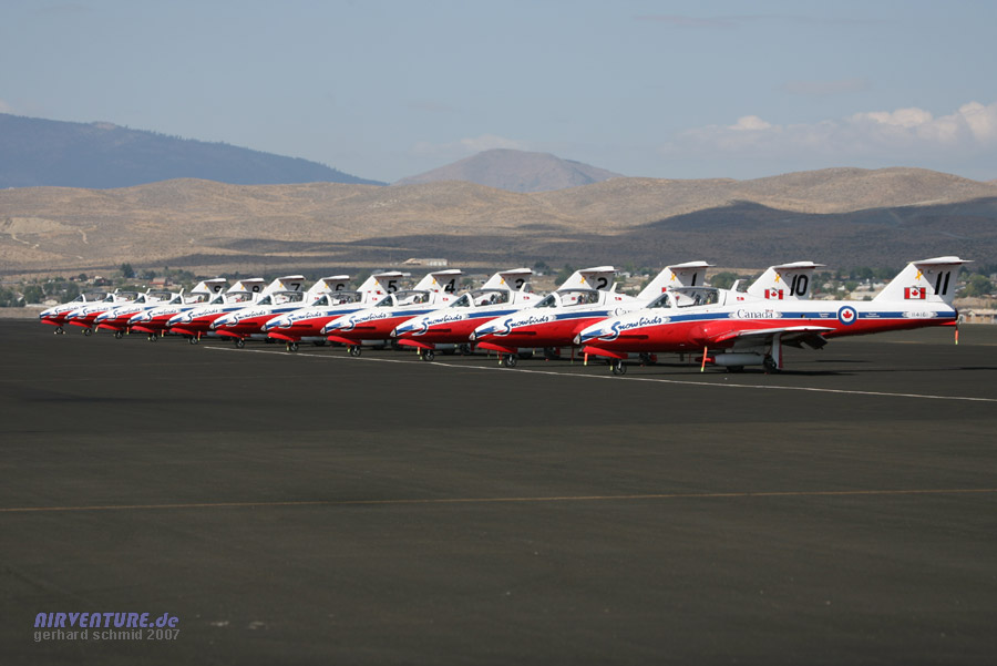 Aufgereiht wie die Perlen einer Kette warten die CT-114 Tutor der Canadian Air Force "Snowbirds" auf den nächsten Einsatz. |