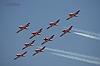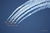 "Big Diamond" heisst diese Formation. Der weisse Rauch im blauen Himmel über der Wüste Nevada zeichnet die Flugbahn der neu, Canadair CT-114 Tutors nach. Die Maschinen befinden sich schon seit 1964 im Dienst der RCAF. |