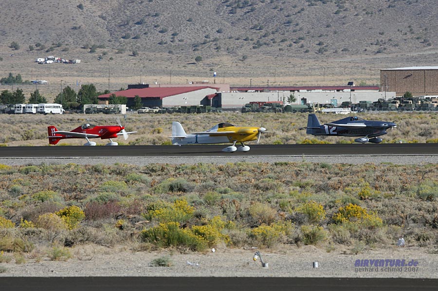 In der Formula One Class beginnt das Rennen mit dem Senken der Startflagge. Dann beginnt der take off in kleinen Gruppen von drei Maschinen, die auf der breiten Startbahn problemlos nebeneinander Platz finden. |
