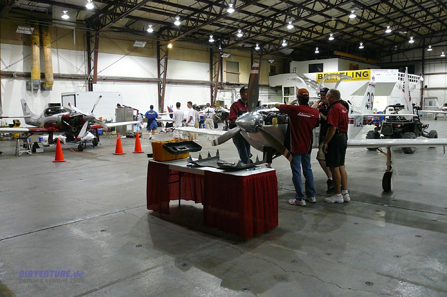 Bis weit in den Abend wird im Sport Class Hangar an den Motoren geschraubt - im Vordergrund das Team #39 von Jeff LaVelle. |