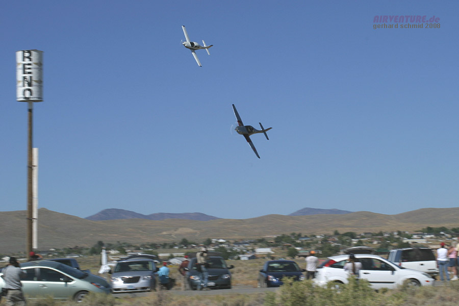 Die Glasair II S TD #40 von Earl Hibler ist die zweite Fixed Gear Maschine. Mit 260,680 mph war er dennoch 9 mph schneller als Craig Sherman in der Glasair III #4, die er auf diesem Bild auf der höheren Flugbahn überholt. |