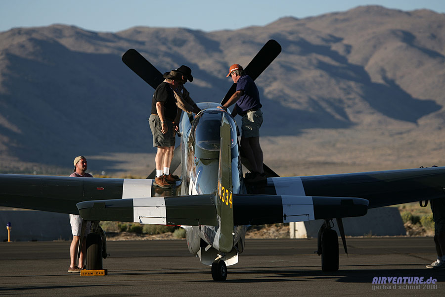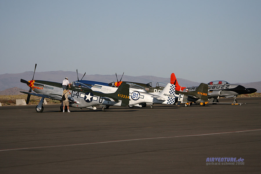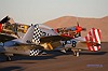 Stock Mustangs im Abendlicht. Im Vordergrund Steve Hintons "Wee Willy". Sie flog nicht im Rennen, hat aber eine höchst interessante Air Racing Vergangenheit. In "Wee Willy" finden sich Teile der berühmten Mustang "Red Baron" wieder. |