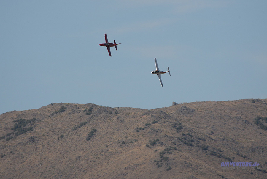 Curt Brown mit der L-29 #77 "Viper" und Joe Gano mit der L-39 #2 "Pip Squeak im Norden des Rennkurses. |