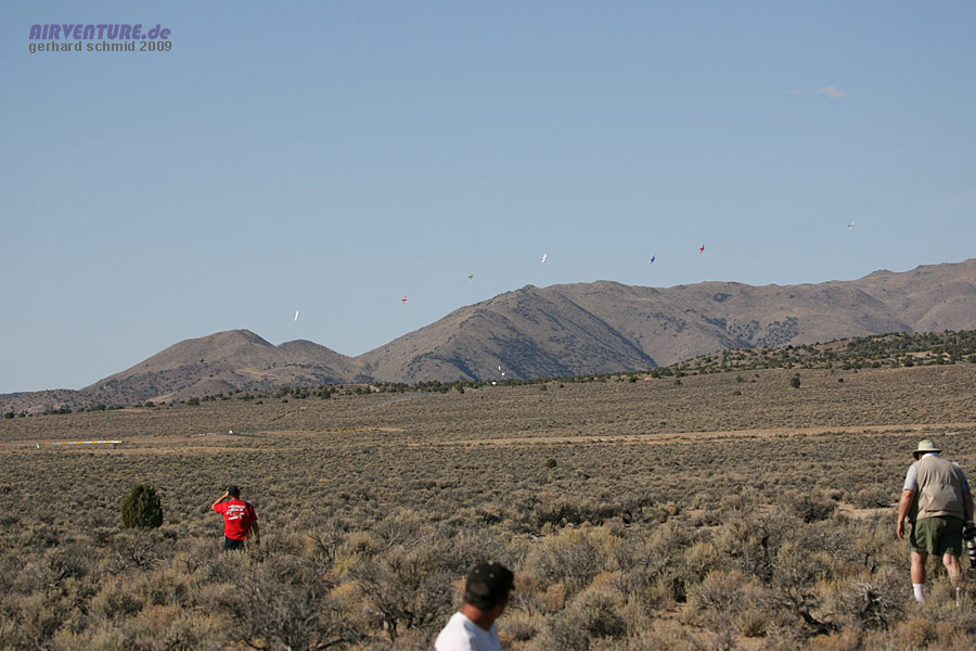 Vor dem Hintergrund der hügeligen Halbwüste passieren die Jets mit mehr als 500 mph die ersten Pylons. Den Fotografen bleibt nun eine halbe Minute ehe die Teilnehmer wieder den Osten des Kurses erreichen. |