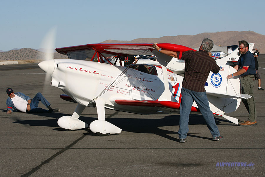 Aufregende Momente sind bei den Reno Air Races dicht gepackt, weshalb man gut beraten ist, die Aufenthaltsdauer als Zuschauer nicht zu kurz zu bemessen. Es passiert immer etwas, oft zur gleichen Zeit an unterschiedlichen Orten. Die Entscheidung fällt nicht leicht. Schaue ich auf dem östlichen Teil des Vorfelds zu, wie die Crew einer Mustang einen Motortestlauf durchführt? Lege ich den Kopf in den Nacken und staune über die sämtlichen Gesetzen der Aerodynamik trotzenden Figuren der bunten Kunstflugmaschine über der Runway des Stead Airport? Oder gehe ich zum Static Display, wo wie jedes Jahr die Rolls Royce Heritage Trophy an den schönsten Oldtimer vergeben wird und deshalb die seltensten Klassiker der Luftfahrt auf Hochglanz poliert um die Wette strahlen...