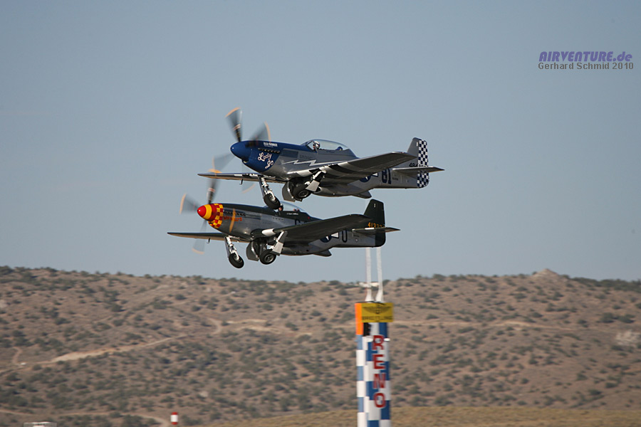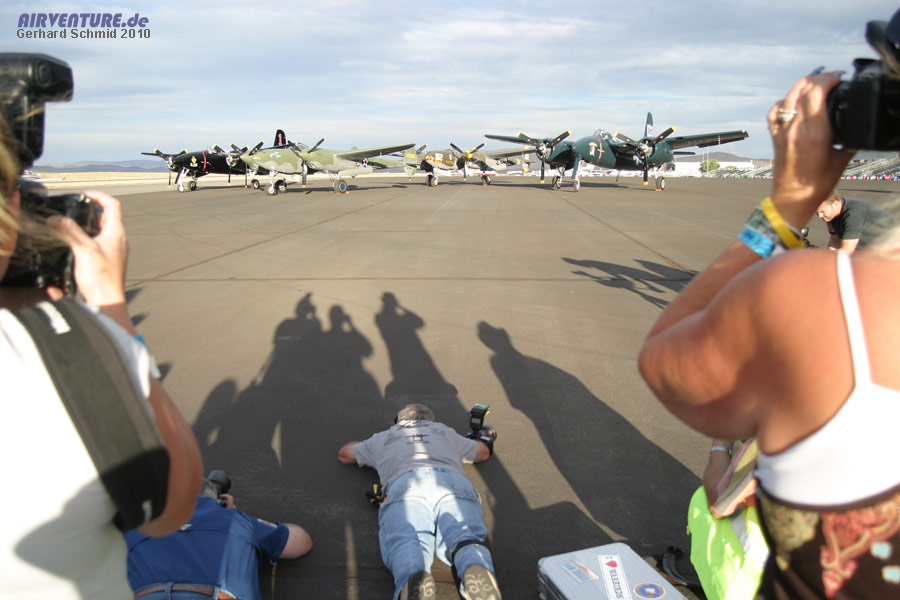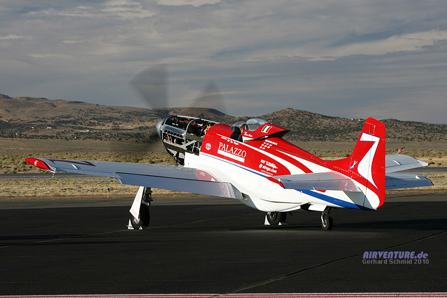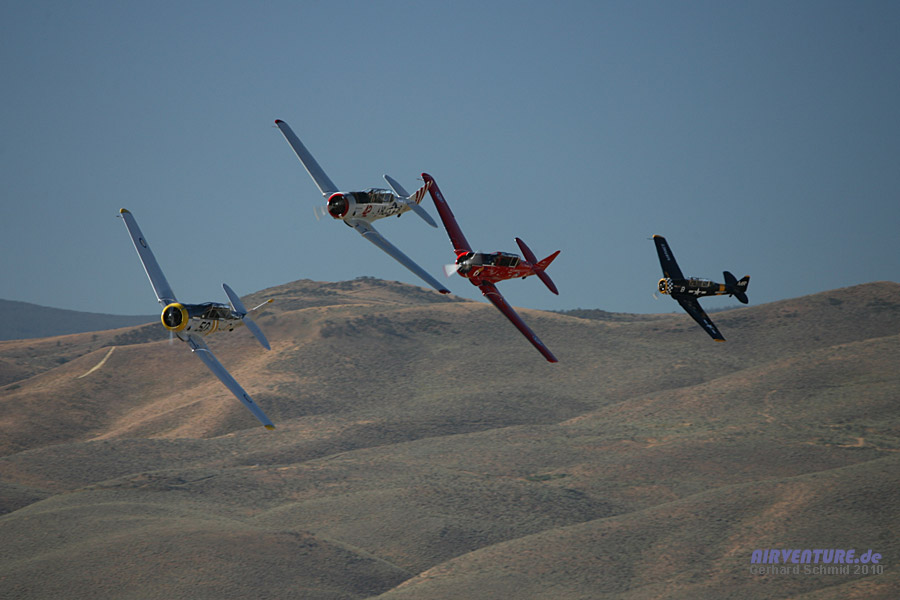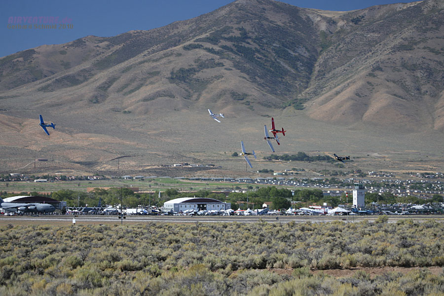 47th National Championship Air Races and Air Show Reno, September 2010 - von Gerhard Schmid - Mehr noch als alle anderen Airshows in den USA ähneln die berühmten Reno Air Races einem großen Volksfest. Fünf Tage lang heizen die Moderatoren Frank Kingston Smith, Steve Stavrikakis und Danny Clishman das Publikum an, stets im spannenden Dialog und mit vielen informativen Stories über Flugzeuge, Piloten und Teams. Wie schon in den vergangen Jahren wird in den Klassen Biplanes, Formula 1, Sport, T-6, Jet und Unlimited um den Rundkurs geflogen, der je nach Rennklasse zwischen 3,17 und 8,43 Meilen lang ist. Die schnellsten Runden werden inzwischen von den Jets geflogen. Deutlich über 500 mph erreichen hier die Schnellsten der Klasse. Als Exoten sind neben den üblichen L-29 und L-39 in diesem Jahr eine DeHavilland Vampire und eine Jet Provost vertreten. Mit Heather Penney, der Tochter des mehrmaligen Unlimited Champion John Penney, fliegt zum zweiten Mal in der Geschichte der Jet Class eine Pilotin um die Pylons - nach Mary Dilda, die 2003 sogar das Jet Class Gold Race für sich entscheiden konnte. Die Umgebung eines Jet-Cockpits ist für Heather Penney allerdings nicht Neues. Den Ritt auf dem Düsenstrahl erlebt sie schon seit Jahren - als F-16 Pilotin bei der US Air Force. Zwischen den Rennen wird die übliche Unterhaltung geboten. In diesem Jahr gibt es neben Kunstflugdarbietungen von Greg Poe, Michael Goulian, Kent Pietsch und David Martin auch die berühmte kanadische Formation "The Canadian Forces Snowbirds" mit ihren neun Canadair CT-114 Tutor zu sehen. Nicht ermittelt werden konnte der diesjährige Unlimited Champion. Dabei ware das Starterfeld im Unlimited Gold mit zehn Flugzeugen ungewöhnlich groß. Ebenfalls groß wäre sicher die Anzahl der Überhol- und Überrundungsmanöver gewesen, denn das Teilnehmerfeld war höchst ungleich. Vorjahressieger Steven Hinton im Cockpit von Strega hat im Vortagesrennen bereits eine Runde mit mehr als 500 mph geflogen während Lady Jo mit Rob Patterson am Steuerknüppel als Sieger des Unlimited Silver nur 342 mph schnell war, mit dieser Platzierung aber dennoch ins finale Gold Race aufsteigen konnte. Wie dem auch sei - böige Winde mit Geschwindigkeiten von mehr als 30 mph haben die alles überwachende FAA dazu bewogen, das Unlimited Gold Race zu canceln. Man darf also spekulieren, wie das Endergebnis wohl ausgesehen haben könnte... Nachfolgend ein paar erste Eindrücke von den National Championship Air Races and Air Show 2010, umfangreiche Berichte folgen in Kürze.