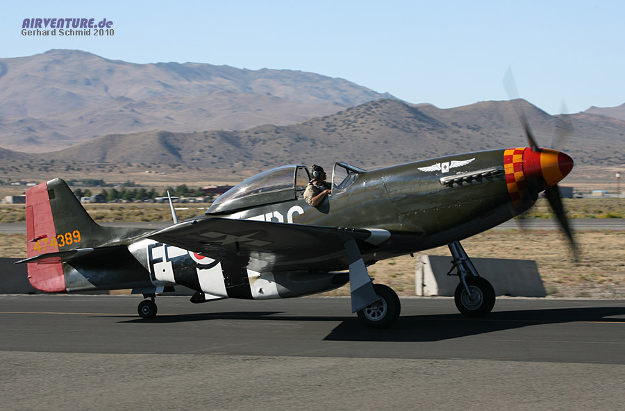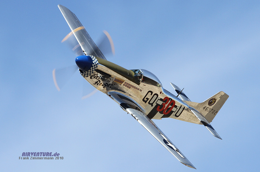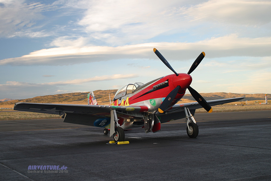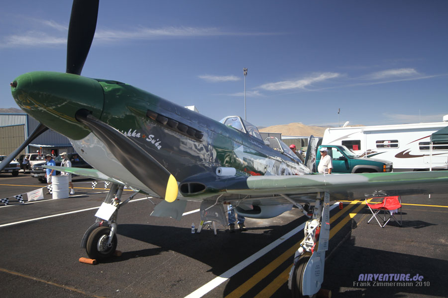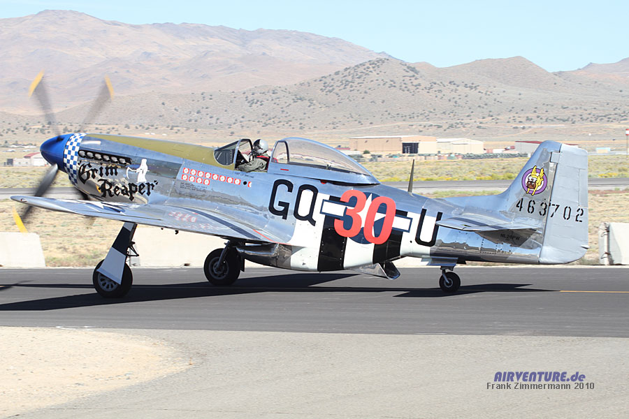 Immer wieder eine Augenweide ist die auf Hochglanz polierte "Grim Reaper" von Sal Rubino. Aber Sal mag nicht selber um den Rennkurs fliegen. Mit Dan Martin hat er einen sehr erfahrenen Piloten in das Cockpit der kostbaren P-51D gesetzt. |