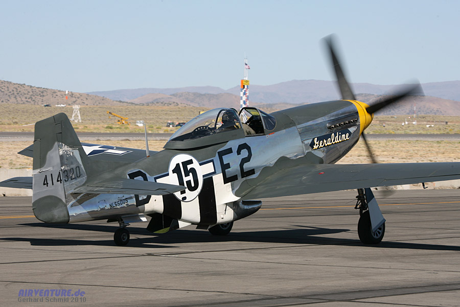 Die P-51D #15 "Geraldine" ähnelt etwas der #16 "Lou IV". Allerdings war sie mit Matt Watt im Cockpit etwas schneller unterwegs und flog mit knapp 340 mph im Unlimited Silver. |