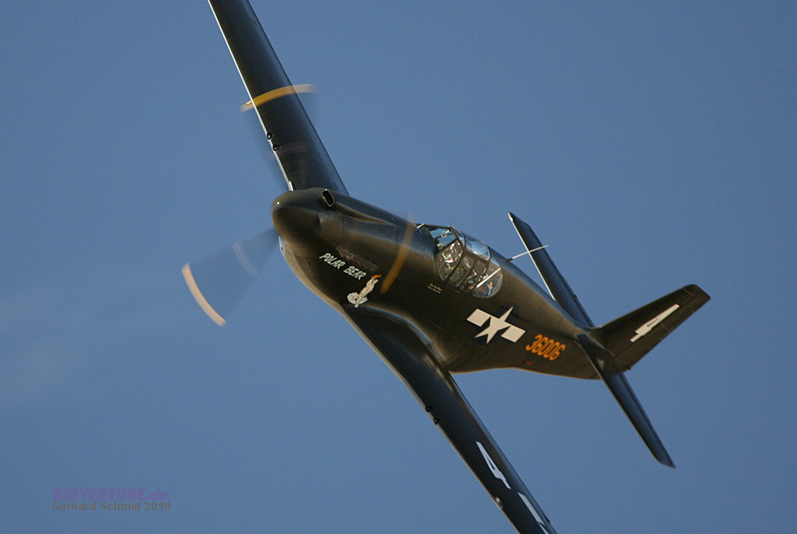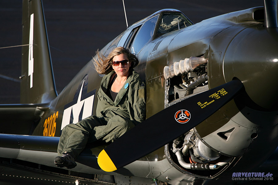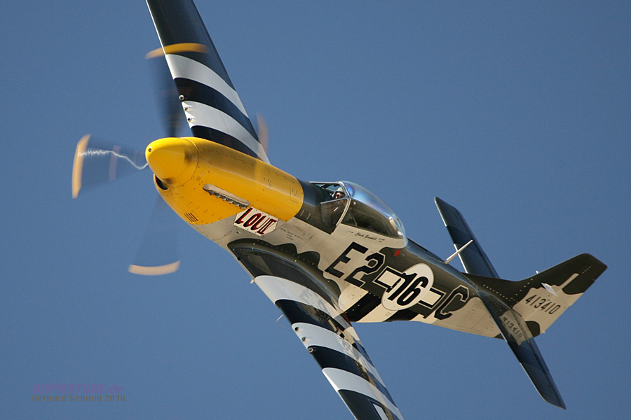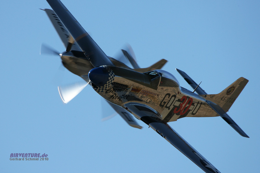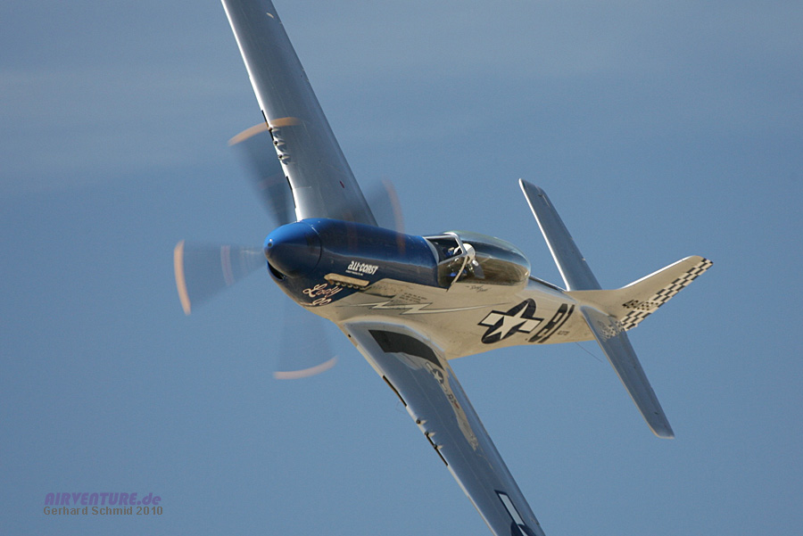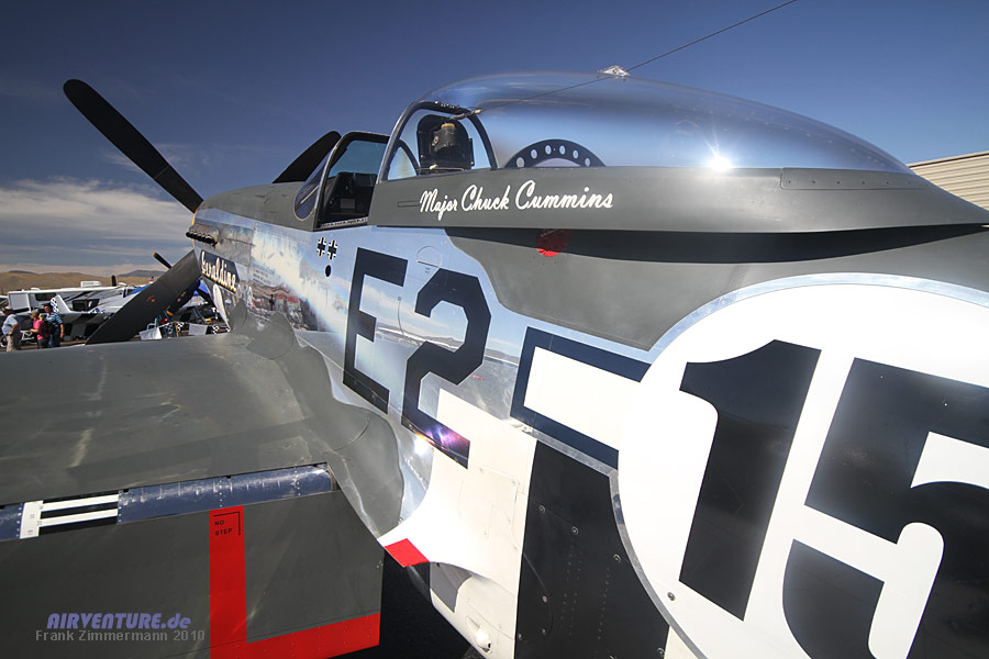 Testpilot Dave Morss fliegt schon seit vielen Jahren die schöne P-51A von Gerald Gabe. Mit mehr als 330 mph flog er dieses Mal komfortabel in der Gruppe Silver mit. |