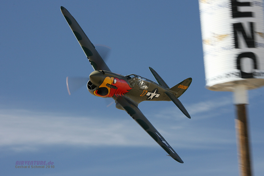 John-Curtiss Paul passiert mit seiner P-40N "Parrothead" Pylon 8. Mit 324,544 mph lässt sich eine tiefe und enge Linie fliegen - zur Freude der Fotografen. |