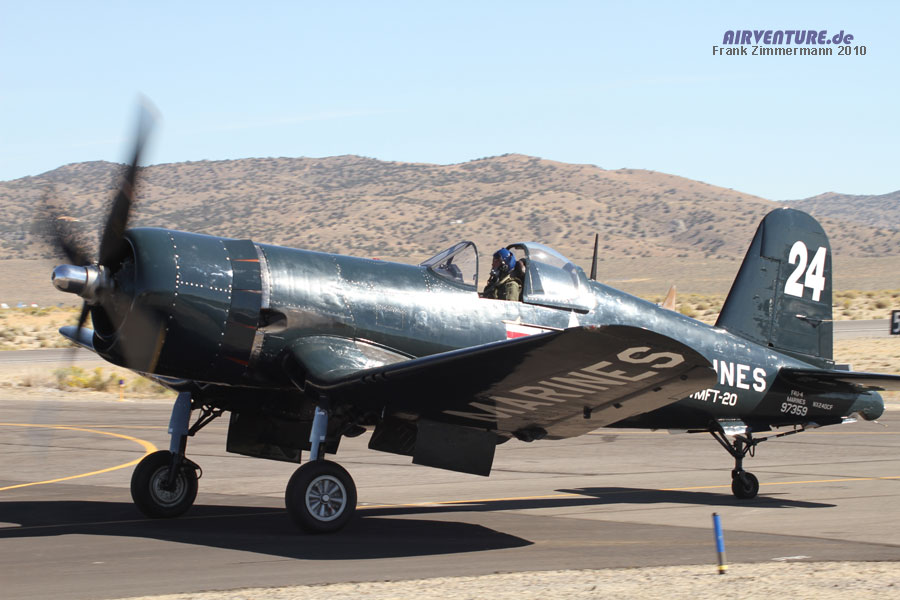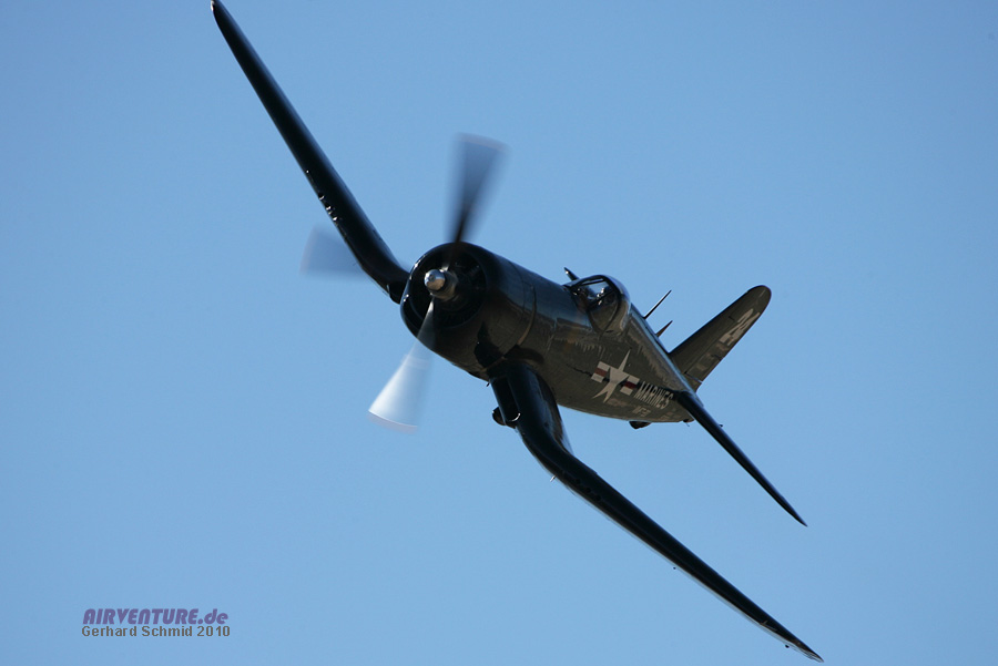 Eine Corsair ist stets eine imposante Erscheinung und eine willkommene Bereicherung der Typenvielfalt in der Unlimited Class. Der schwere Jäger mit Doug Matthews im Cockpit bleibt mit rund 330 mph jedoch im hinteren Mittelfeld. |