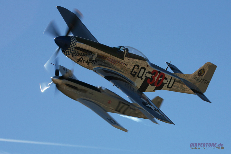 Zwei der erfahrensten Unlimited Air Racing Piloten: Dan Martin in Sal Rubinos Stock Mustang "Grim Reaper" wird überholt von Jimmy Leeward in seiner extrem modifizierten Mustang "Gallopping Ghost". |