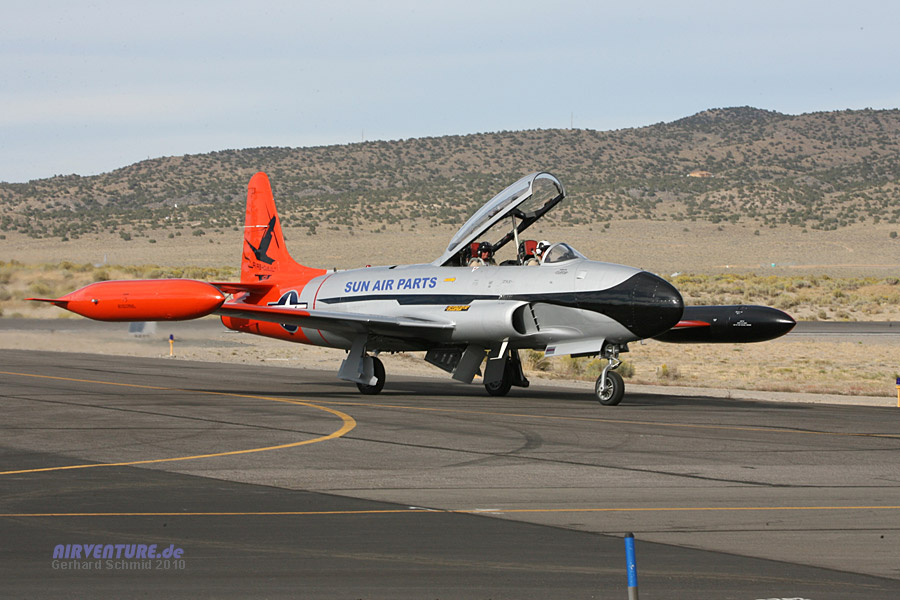 Mit wachsamem Auge kreiste Steve Hinton in der T-33 des Planes of Fame Museum über den Unlimited Races. Im Falle eines "Mayday" kann man wohl keinen erfahreneren Beistand bekommen... |