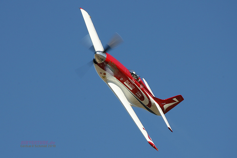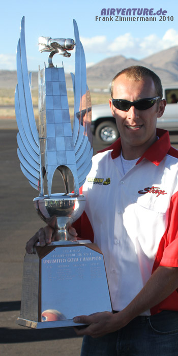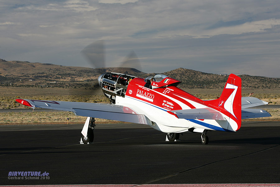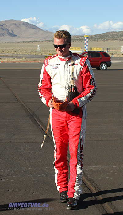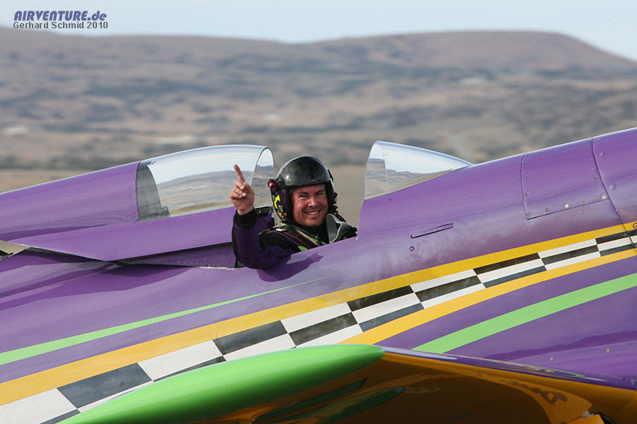 Steven Hinton. Er ist der jüngste Unlimited Air Racing Pilot seit Beginn der Reno Air Races und fliegt eine der schnellsten Maschinen im Feld - Tiger Destefani's #7 "Strega". 2009 übergab der Teambesitzer und siebenfache Gewinner das Cockpit. Steven, der schon seit Jahren als Mechaniker im Team Strega gearbeitet hat, dankte es mit 491,822 mph, dem Sieg des Races 2009 und zugleich einem neuen Race Record. |