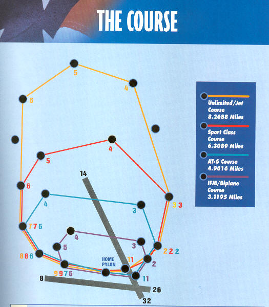 Die Rennkurse:   Weitestgehend unverändert wurden auch bei den 39. Reno Air Races die seit dem Jahr 2000 festgelegten Kurse geflogen. Die enormen Geschwindigkeitsunterschiede der verschiedenen Rennklassen ergeben eine Spanne, die von 200 mph (Biplanes) bis fast 500 mph (Unlimited) reicht. Dazwischen liegen die Klassen T-6 (230 mph), Formula One (245 mph) und Sport Class (330 mph). Die in diesem Jahr neu eingeführte Jet Class bewegt sich mit bis zu 450 mph um die Pylons. Damit die Rundenzeiten der unterschiedlichen Klassen annähernd übereinstimmen, existieren vier Kurse, die auf dem nebenstehenden Bild betrachtet werden können. Racing Course 2002