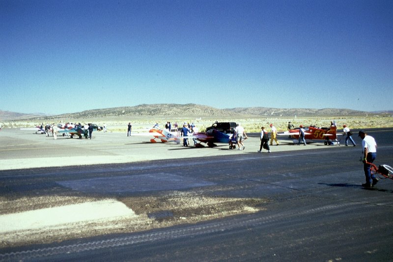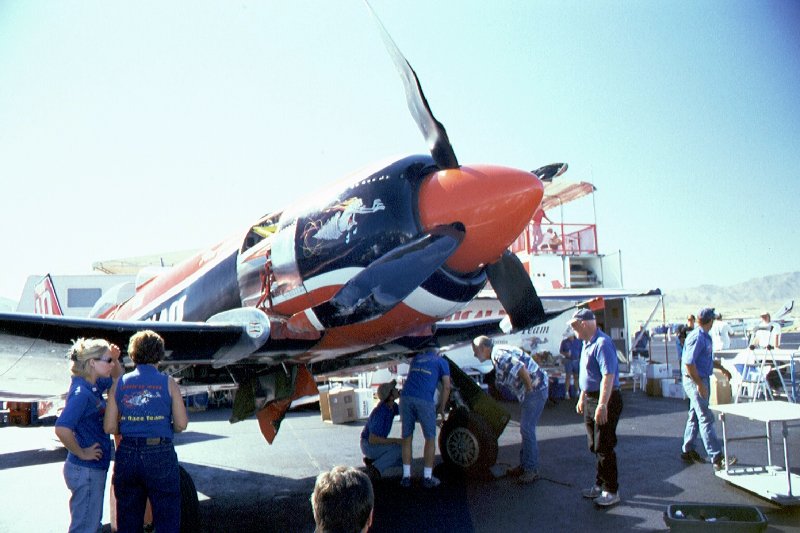 Die Teilnehmer:   Jedes gemeldete Team besteht aus Pilot(en) und Crew. Da bei den Reno Air Races im Gegensatz zu Veranstaltungen wie "Formel 1" auch dem Besucher der Zugang zu den Boxen möglich ist, kann man den Mechanikern zwischen den Rennen über die Schulter sehen. In den "Pits" herrscht stets hektische Betriebsamkeit, da vor allem die hochgezüchteten Motoren sehr empfindlich und wartungsintensiv sind. Immerhin zaubern die Tuner aus einem Rolls Royce Merlin mehr als das doppelte der serienmäßigen ca. 1.490 PS. Bei den Spitzenteams wird von 4.000+ PS gemunkelt. Mit etwas Glück kommt man sogar mit den "Jockeys" dieser schnellsten Kolbengetriebenen Propellermaschinen der Welt ins Gespräch und lernt dabei Testpiloten, Astronauten, Millionäre, Ärzte, Rechtsanwälte, Rentner, ehemalige Kampfflieger und Flugkapitäne kennen.
