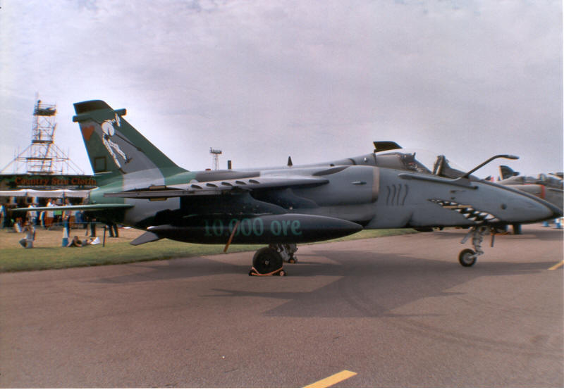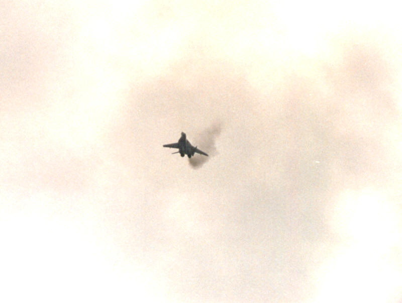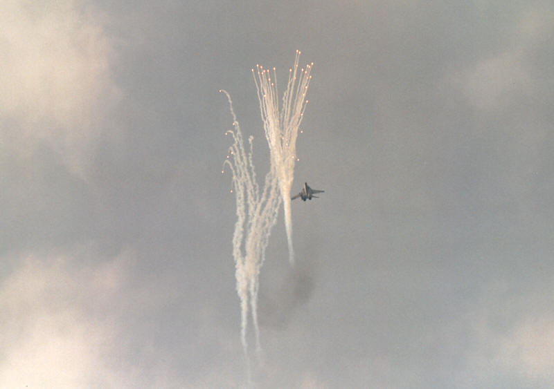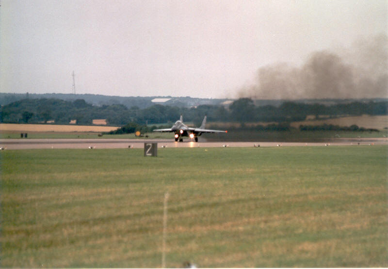 Das RIAT ist berühmt für seine große Zahl an internationalen Gästen im Flugprogramm. Auch dieses Jahr wurden diesbezüglich wieder eine Menge rasanter Vorführungen geboten. Hier beweist gerade Major Vari von der Ungarischen Luftwaffe mit einer Mikojan Gurewitsch MiG-29, daß unser neuer NATO-Partner Ungarn offensichtlich sehr gute Piloten in das Bündnis eingebracht hat. Die Besatzungen welche beim RIAT an den Flugvorführungen teilnehmen können für ihre Leistungen auch Preise gewinnen. Und Major Vari hat mit seiner MiG-29 Vorführung derart beeindruckt, daß er dafür gleich 2 Preise gewonnen hat: Die "Lockheed Martin Cannestra Trophy" für die beste nichtbritische Flugvorführung (best overseas participant) und die "As the Crow Flies Trophy", welche von den Friends of RIAT verliehen wird. Wie man sieht beinhaltete Major Varis Vorführung den großzügigen Einsatz von "Flares". Hierbei handelt es sich um Hitzetäuschkörper, die mit ihren heißen Temperaturen in einem Luftkampf gegnerische wärmesuchende Raketen ablenken sollen. Spektakulär anzusehen war auch das "Tailslide"-Manöver, bei dem - deutlich auf dem Foto sichtbar - das linke Triebwerk einen "Flameout" hatte.