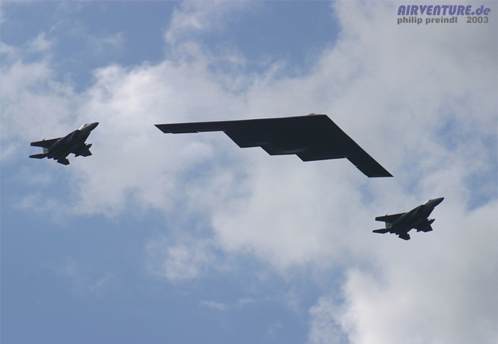B-2 zusammen mit zwei McDonnell Douglas F-15 Eagle Kampfflugzeugen zu sehen. |