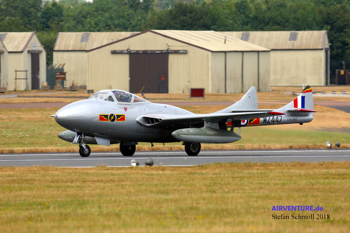 Neben der DH.100 Vampire FB.52 LN-DHY ist bei den Norwegern auch die DH.115 T.11 Doppelsitzer LN-DHZ im Einsatz. Man mag kaum glauben, dass diese Jets der ersten Generation teilweise aus Holz gefertigt wurden. |