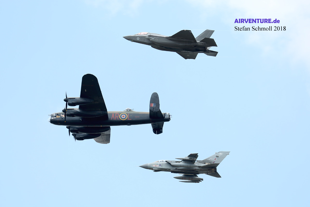 Die Lancaster hatte gleich noch einen zweiten Job: Seit diesem Frühjahr wurde die berühmte 617 "Dambuster" Squadron wieder in Dienst gestellt. Vor ihrer zeitweiligen Auflösung flog sie MRCA Tornado und wird jetzt mit der brandneuen F-35 ausgerüstet. Grund genug natürlich, mit diesem einzigartigen FlyPast an die lange Geschichte der Staffel zu erinnern. |