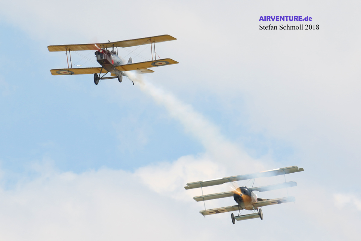 Das http://www.greatwardisplayteam.com/ war eine willkommene Abwechslung zu den sonstigen Vorführungen in Fairford und sorgten für etwas "Entschleunigung". Das Team bietet eine Show von bis zu 9 nachgebauten WW.I Flugzeugen, die sich in "Dog-Fights" gegenseitig bekämpfen und so den Luftkampf aus jener Zeit auferstehen lassen. |