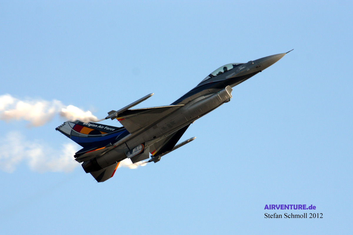 Als letzter Teilnehmer erhebt sich am frühen Sonntagabend das offizielle F-16 Demoteam der Belgischen Luchtkomponent zum Heimspiel in den Himmel. |