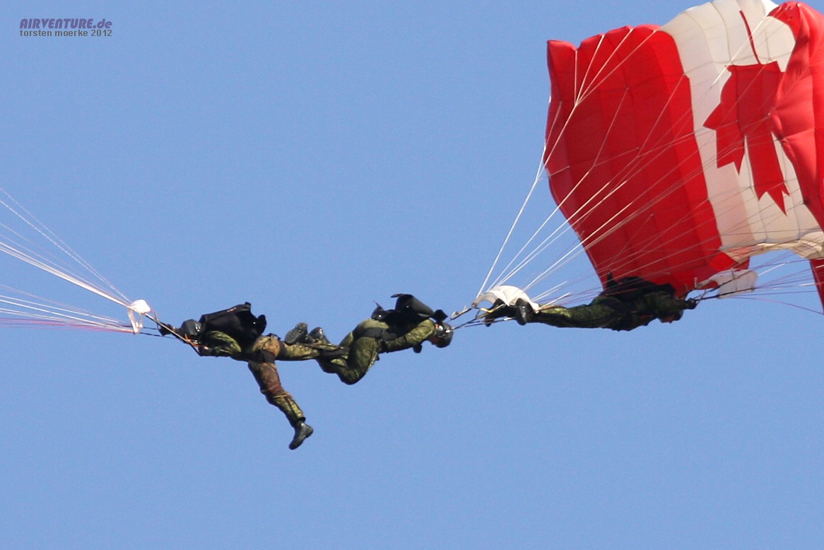 Das kanadische Fallschirm-Demo-Team "Skyhawks" eröffnete sein Programm mit den Landesfarben des Gastgebers. |