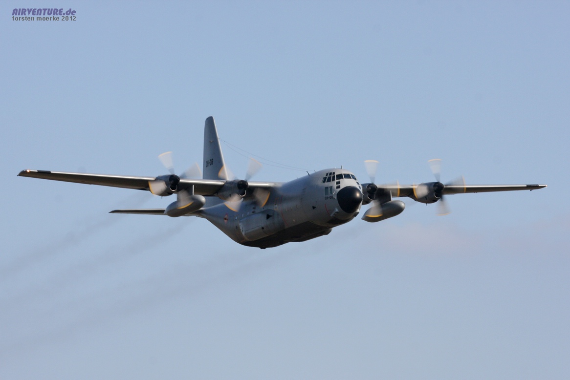 Zum Absetzen der Skyhawks (siehe Teil 1) diente eine C-130 Hercules der Belgischen Luftwaffe, die später auch im tiefen Überflug zu sehen war. |