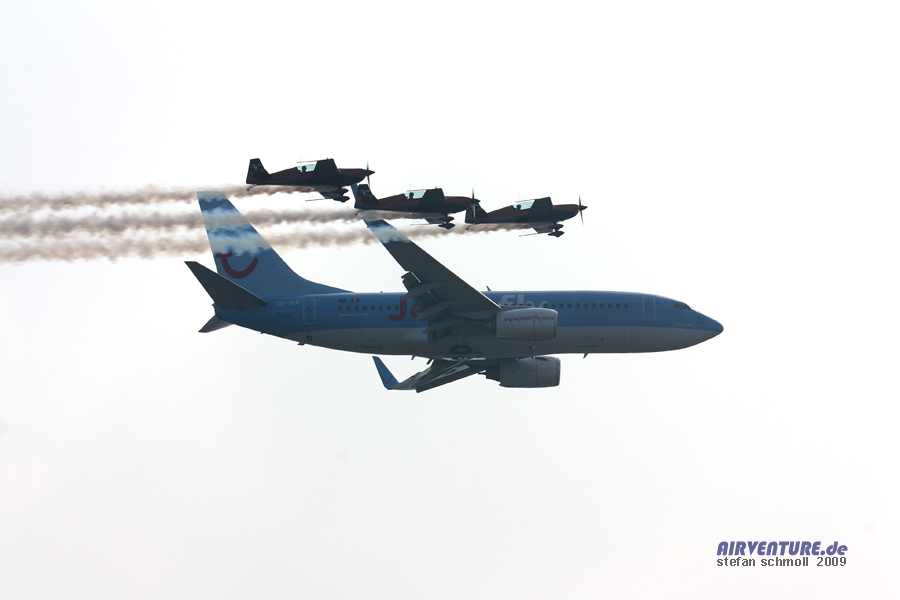 Die schon aus den Vorjahren bekannte Jetair 737 wurde dieses Jahr in Formation mit den Blades gezeigt. Nach mehrfachen Überflügen gab es noch ein kleines Solo-Display des Airliners zu sehen. |