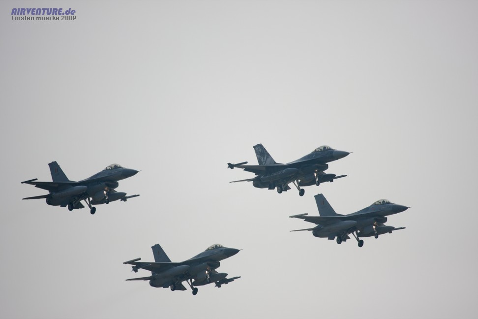 Eine Formation aus vier belgischen F16. Die angekündigte Formation aus vier Mirage 2000 war leider ein weiteres Opfer des schlechten Wetters...