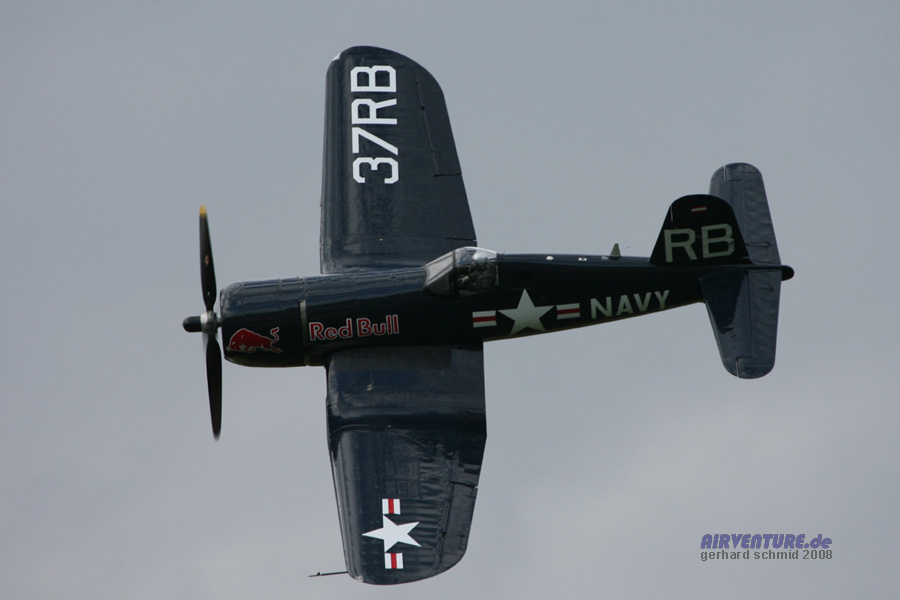 Stärkste Kolbenmotormaschine bei Tannkosh dürfte die Chance Vought F4U-4 Corsair der Flying Bulls, geflogen von Matthias Dolderer sein. 2100 PS Leistung aus 18 Zylindern bringen beim Start die Erde zum Beben. |