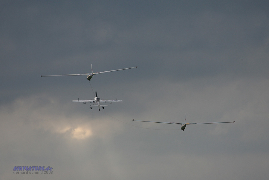 Zwei Blanik L 13 Ganzmetall-Segelflugzeuge im Schlepp sind kein Problem für die bärenstarke Yak-55 von Uli Dembinski. |