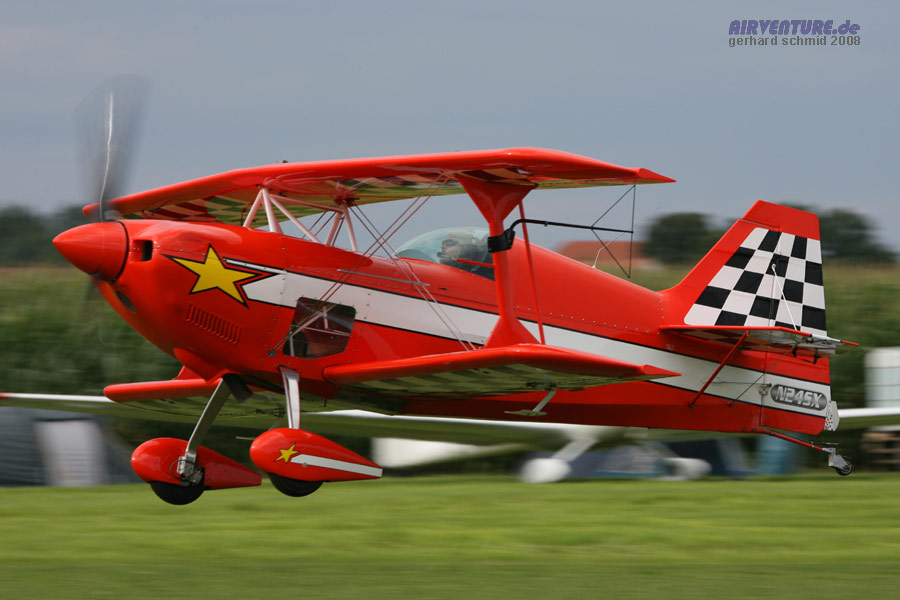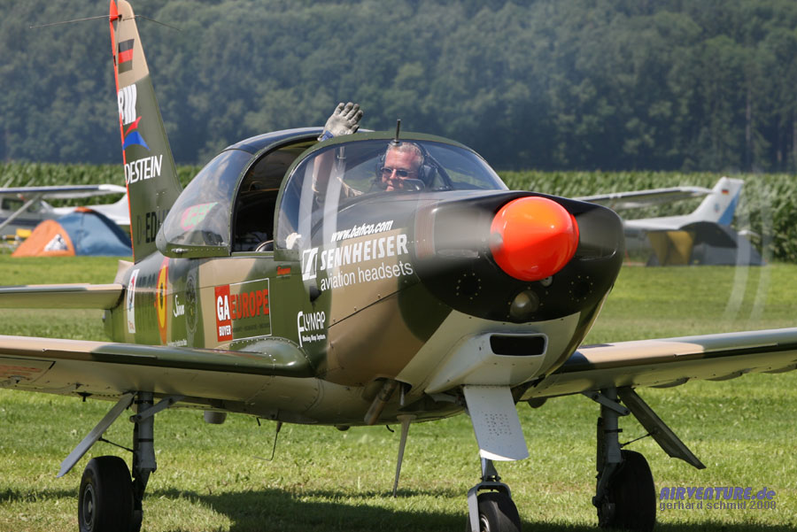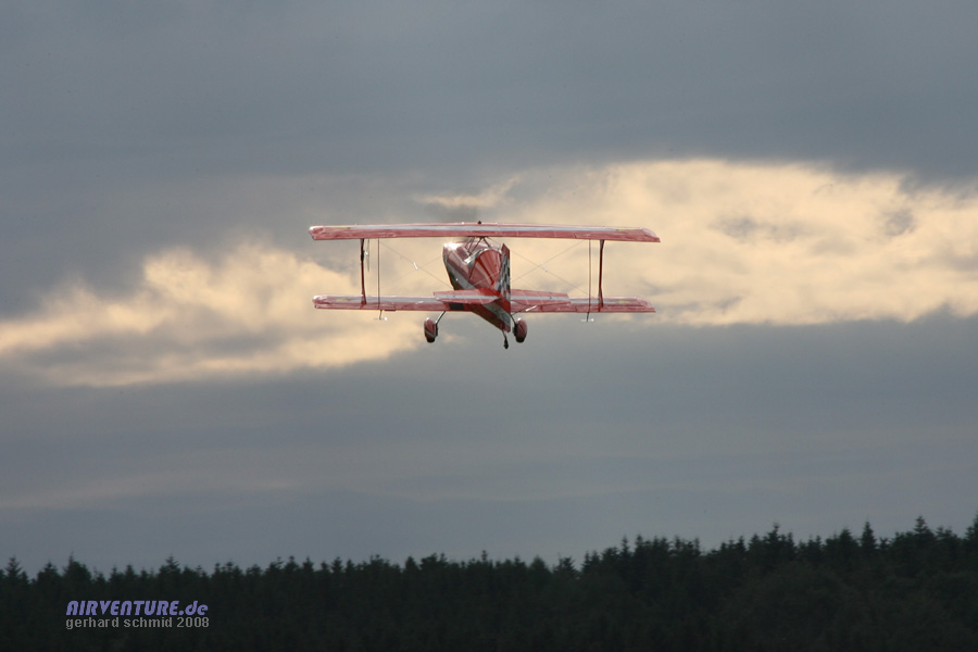 Michael Zacherl hatte mit seiner farbenfrohen Experimental Pitts S-1S wohl einen der kürzesten Heimflüge - nach Kempten (EDMK) beträgt die Flugzeit etwa 10 Minuten. |