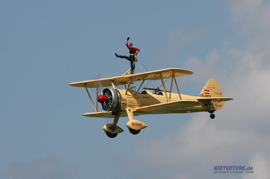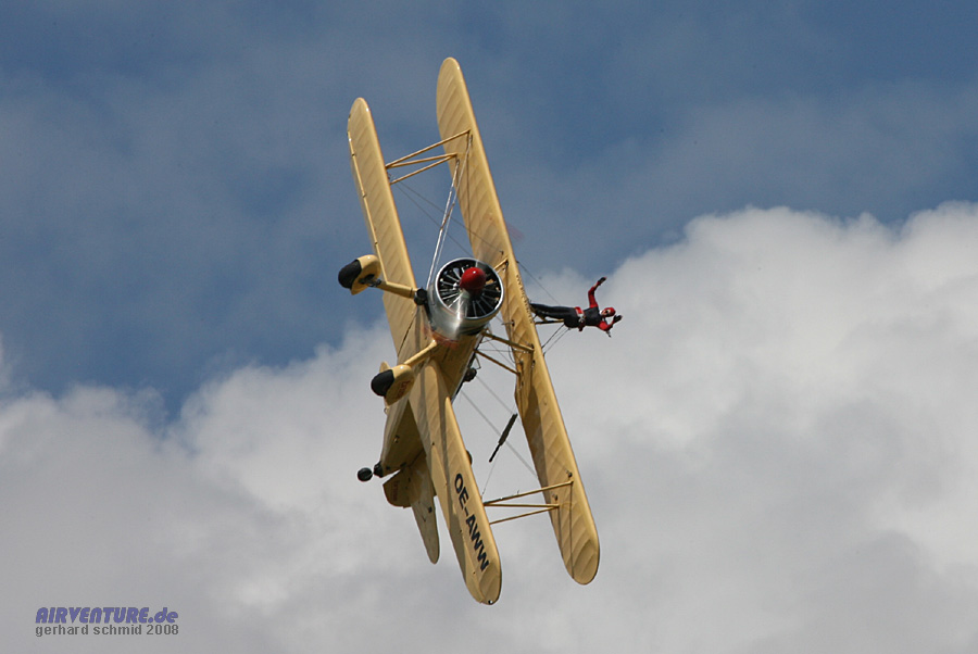 Wer sich an die ersten, eher zaghaften Wingwalking-Vorführungen von Peggy erinnert, der kommt von Jahr zu Jahr mehr ins Staunen. Inzwischen gehört auch einfacher Kunstflug zum Programm. |