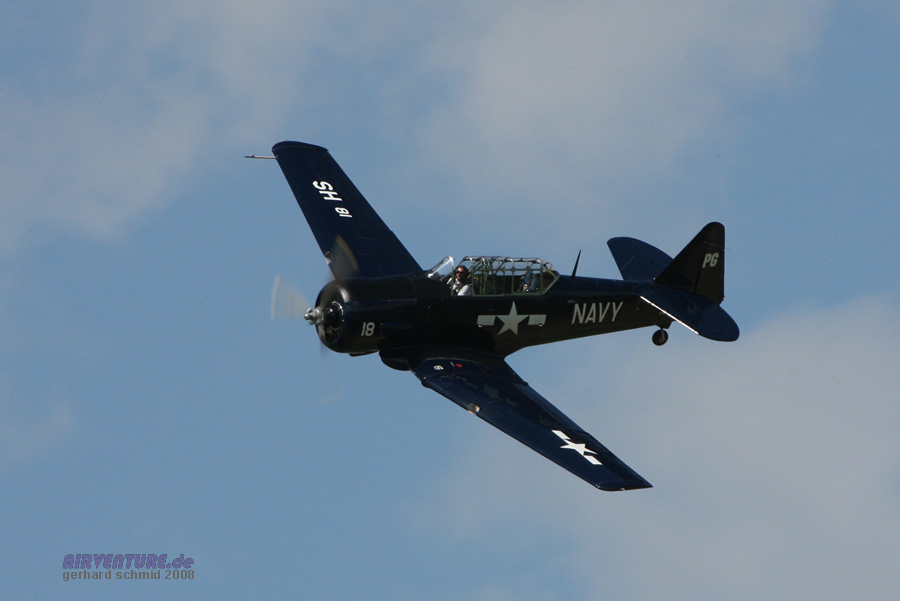 Am Flughafen Memmingerberg (EDJA) ist die North American AT-6 "Miss Goosebay" stationiert. Die Vorführungen von Peter Gutmann gehören seit Jahren fest zum Tannkosh-Programm. |