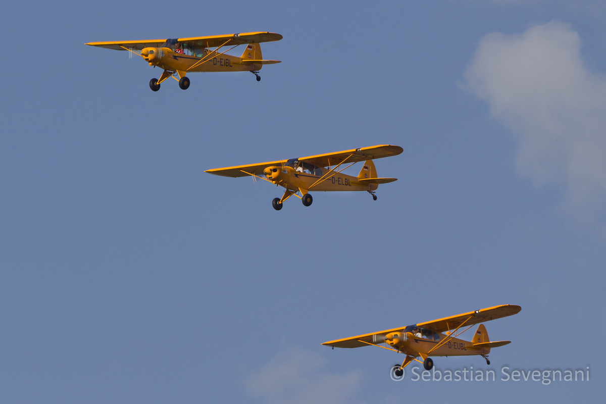 Ein wenig Fluggeschichte wurde dann am Nachmittag mit der BL-Formation, hervorgegangen aus der Burda-Staffel, präsentiert. Die Formation besteht aus drei PA-18 Super Cub. Hier mit dem rollenden Verkehr parallel zur Betriebspiste. |